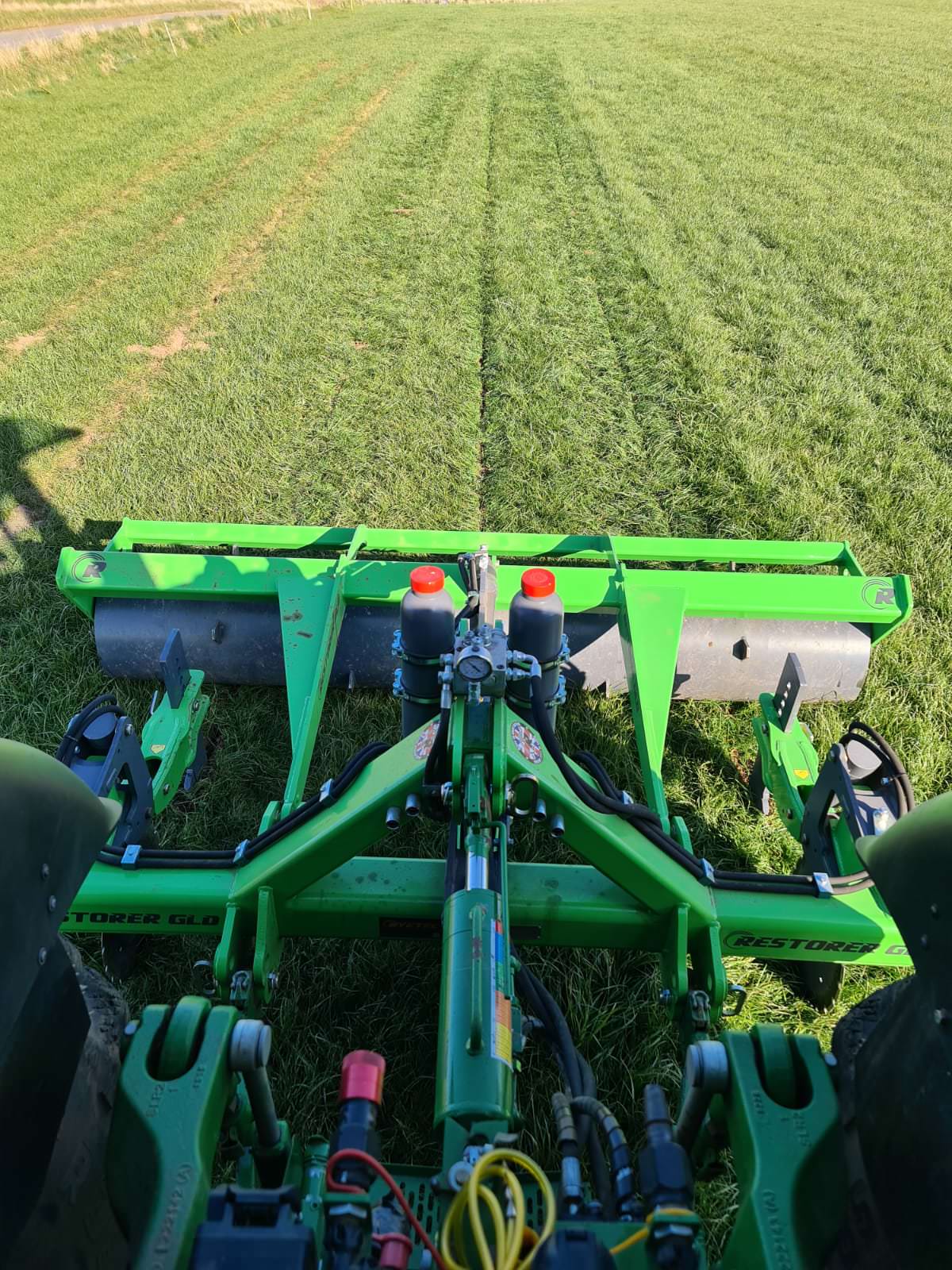 Fabricado por Ryetec, el subsolador Restorer GLD es un subsolador de baja alteración para pastizales, diseñado para aflojar el suelo, romper la capa compactada, mejorar el drenaje, eliminar la compactación y optimizar la aireación. Los discos cortan la superficie inicial, permitiendo que las patas del subsolador rompan el subsuelo. Esto crea fisuras que facilitan el crecimiento de las raíces, el drenaje del agua y una mejor oxigenación. El rodillo compactador cierra la superficie del pasto, dejándola prácticamente intacta. Todo esto contribuye a la recuperación de sus pastizales, logrando un crecimiento más productivo del pasto y temporadas de pastoreo y producción de forraje más prolongadas.